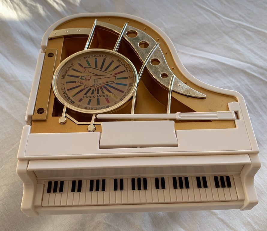 Kurmalı, müzikli dekoratif mini piyano. Kurma mekanizması sorunsuz çalışmaktadır, müzik net şekilde çalmaktadır. Kırık, çatlak, sararma yoktur; çok temiz kondisyondadır. Dekorasyon amaçlıdır, müzik kutusu / biblo olarak kullanılabilir.
