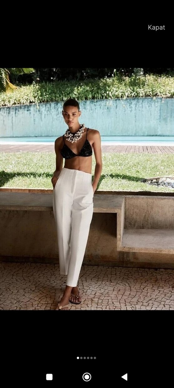 Karol kadın pantolon, midi boy, rahat kesim ve ipeksi kumaştan.