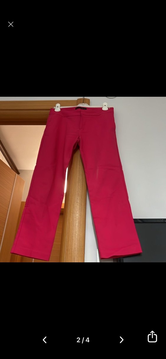 Pembe renkli, parlak kumaştan yapılmış, kemerli ve midi boy, rahat kesim kadın pantolonu. Ofis kullanımı için uygundur. 38 bedene uygundur.
