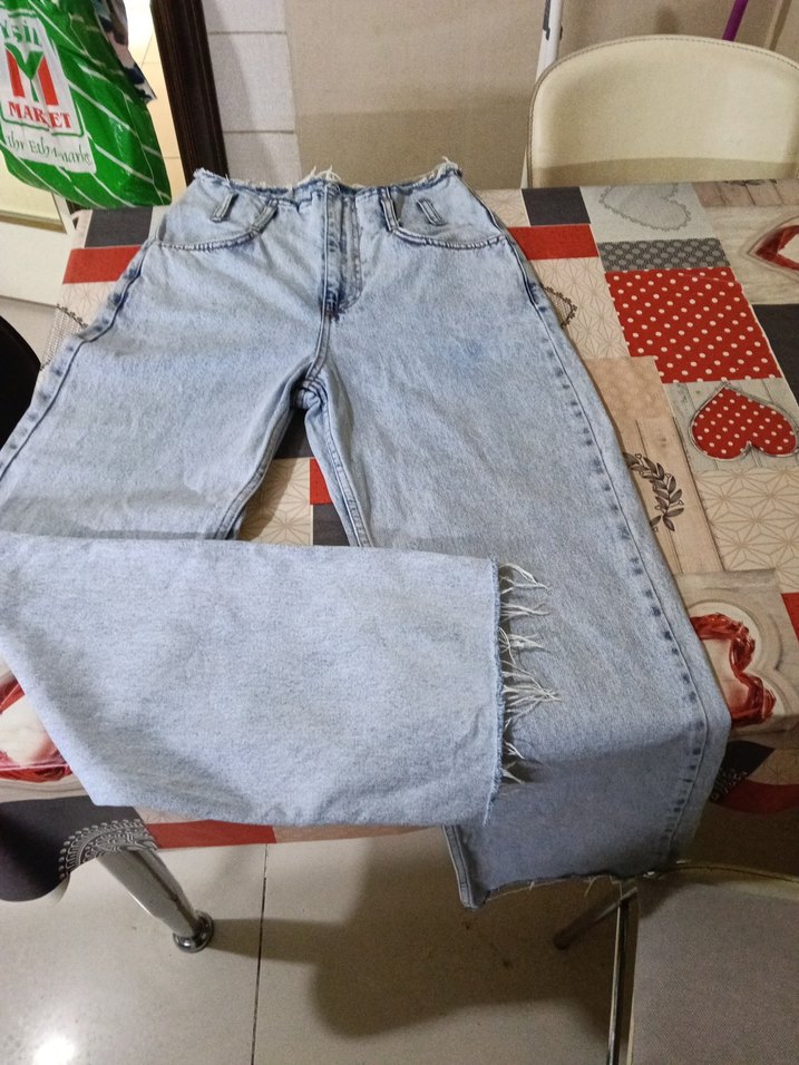 bel 38cm uzunluğu 108cm paça en 24cm rahat ve şık sokak stili için uygundur. Günlük kullanıma ideal.dokusu güzel kalitesi yüksek sadece arka bacak ıc kdımda küçük sarılık var çıkar mı bılmıyorum am çok gotunkuyor son fotoda bakabilirsiniz