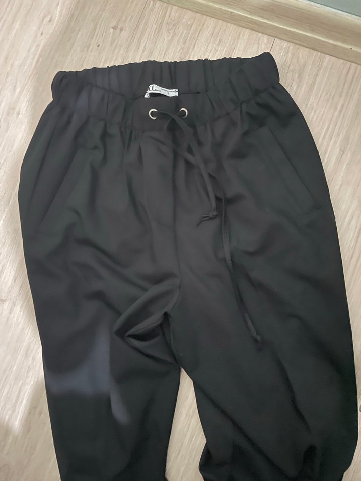 Siyah, sentetik kumaştan, elastik bel ve bağcık detaylı, rahat kesim midi boy kadın pantolonu, dış mekan kullanımı için uygundur.