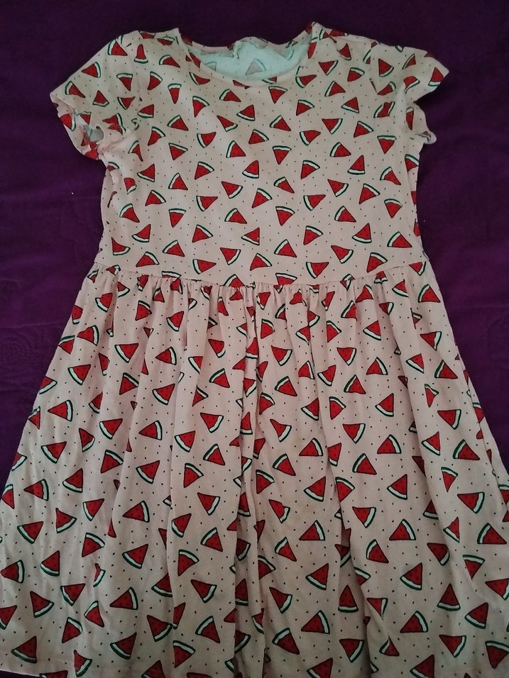 Renkli karpuz desenli, kısa kollu, V yakalı, bol kesim pembe elbise. Fırfır detaylarıyla bohem tarzı yansıtıyor.