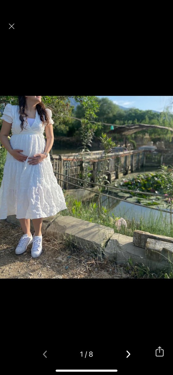 Beyaz renkli, kumaşı efil efil, dantel detaylı, kısa kollu ve V yaka hamilelerinde kullanabileceği midi elbise. Ben cinsiyet kutlamamız için tercih etmiştim aşırı konforlu ve rahattır. Bol kesimi ve bohem tarzıyla düğünler için de uygundur.