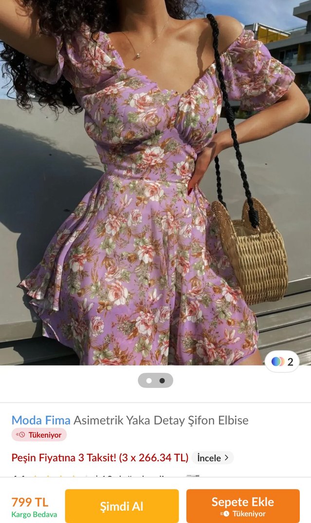 içinde şort bulunmuyor, etek kısmı iki katlı iç katında beyaz astarı bulunuyor. Mor renkli, çiçek desenli, asimetrik yakalı ve dantelli detaylı, ince askılı, bohem tarzda mini elbise. Hafif ve yumuşak sentetik kumaştan üretilmiştir.
