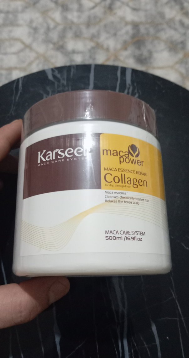 Karseer Maca Power Collagen saç maskesi, kimyasal işlem görmüş saçları temizler ve hassas saç derisini rahatlatır. 500ml hacminde.