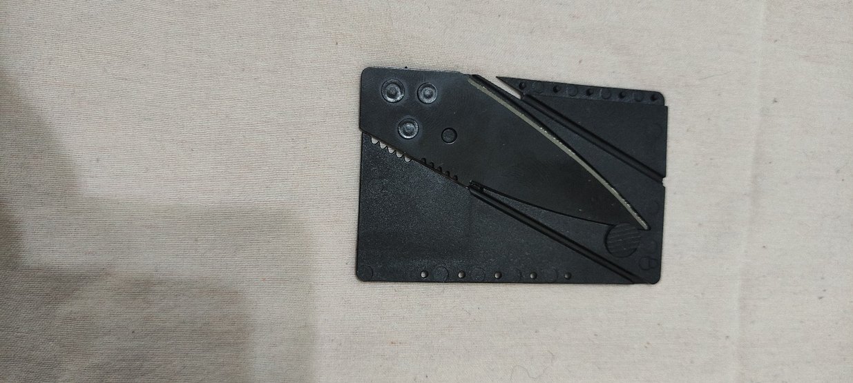 Dişli kenarlı ve sağlam yapılı siyah çok amaçlı katlanabilir bıçak, çeşitli kesim işleri için uygundur.