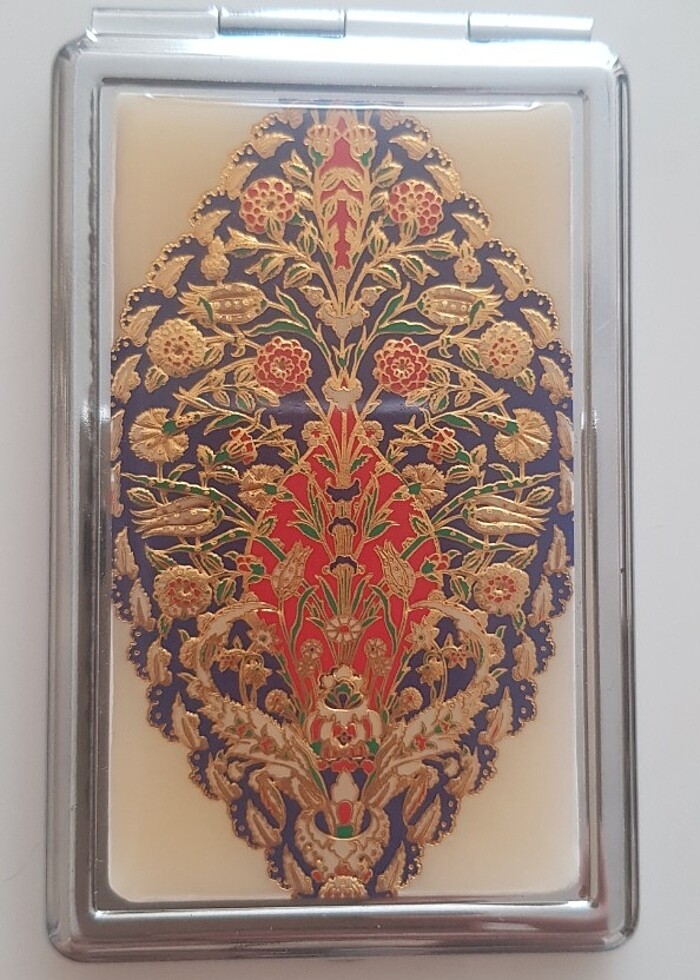 Az kullanılmıştır. Tamamı metal ve üstünde kilim deseni vardır 2 bölmeden oluşmaktadır. 1 tarafı kartlık diğer tarafı aynadır.