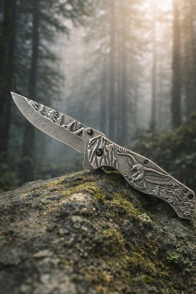 Detaylı gravürlü gri saplı, katlanabilir ve keskin bıçağa sahip bıçak. Çok amaçlı kullanıma uygundur. ️