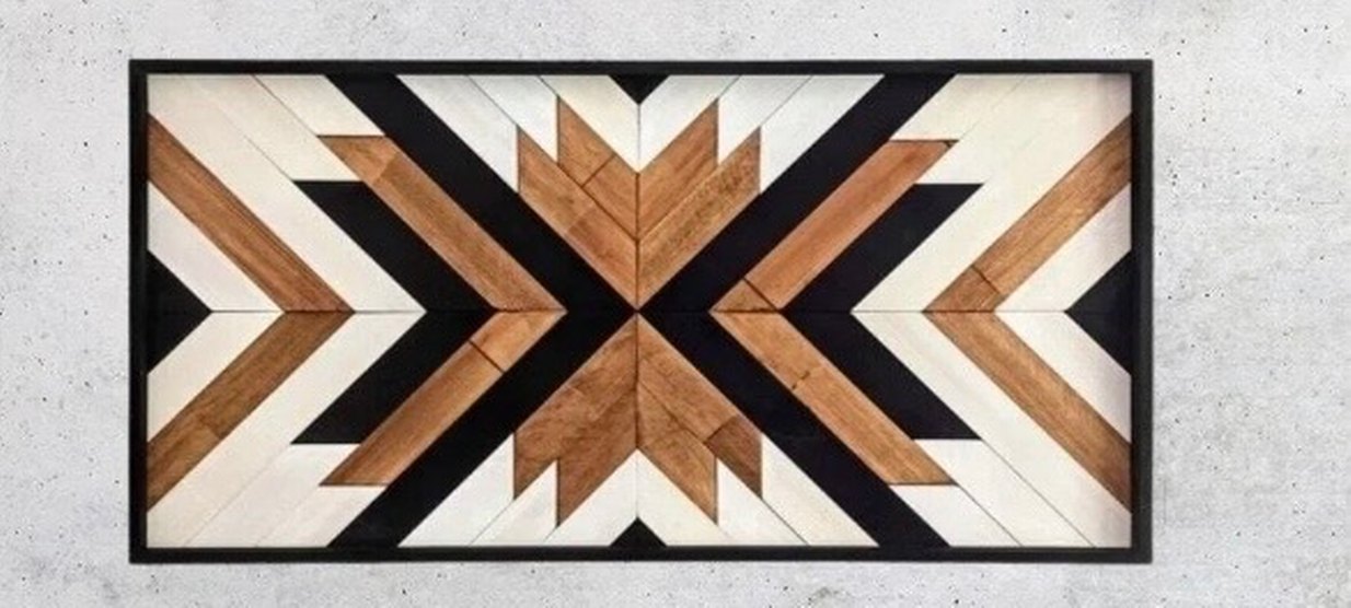 Kahverengi ahşap parçalar ve siyah-beyaz detaylardan oluşan koyu renkli geometrik karyola başlığı . Sıfır ayarında tertemiz sorunsuz.