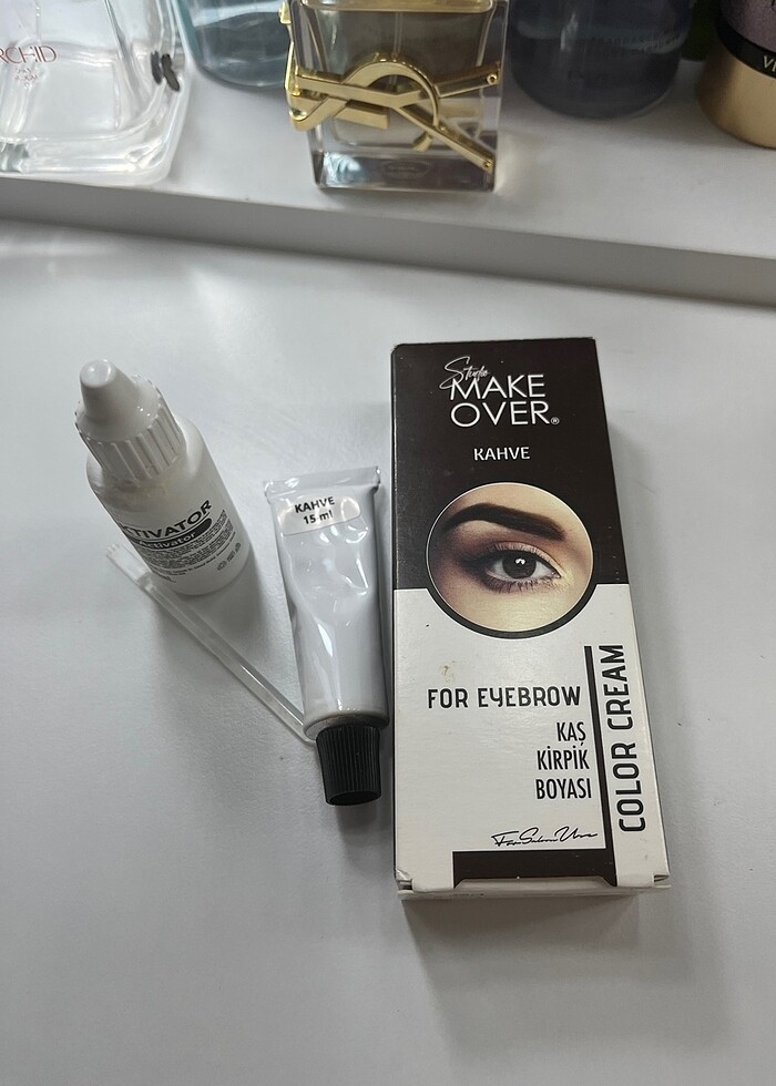 Kahve renk kaş boyası aplikatörü ve karıştırma kabı da birliktedir