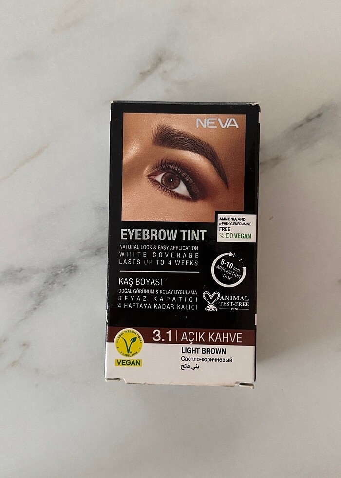 3.1 açık kahve. Kaş boyası Sıfır ürün. Skt vb özellikler fotoğraflarda mevcut. 20.05.2029 skt. Marka ve kullanım durumu öylesine seçilmiştir.