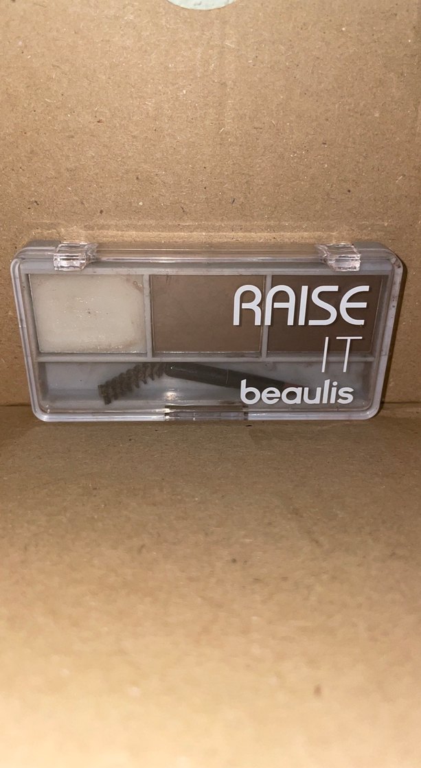 Beaulis Raise It kaş farı paleti, bej ve gri tonları ile küçük bir fırça içerir. Kompakt ve pratik makyaj için uygundur.