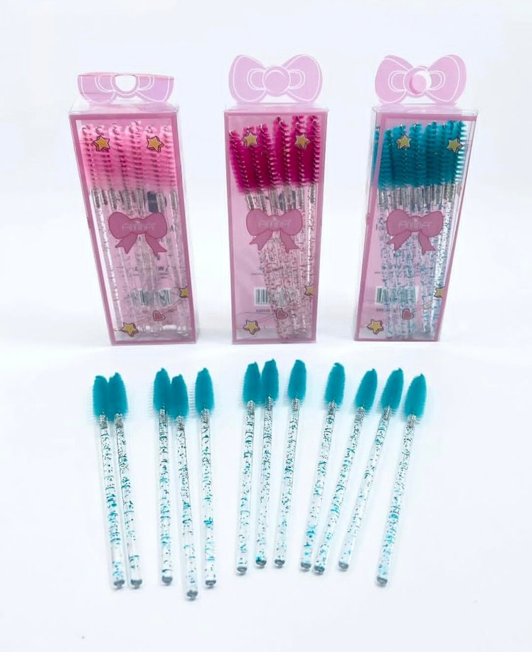 Pembe ambalajda, mavi kıllı renkli makyaj fırçaları. Her fırçanın desenli sapı kolay tutuş sağlar.
