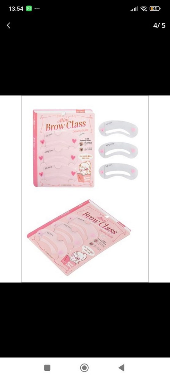 Parlak bej renkli, baskılı mini kaş şablonları. Farklı boyutlarda kaş şekillendirme için rehber içerir. Pastel ambalajda, "BrowClass" etiketiyle.