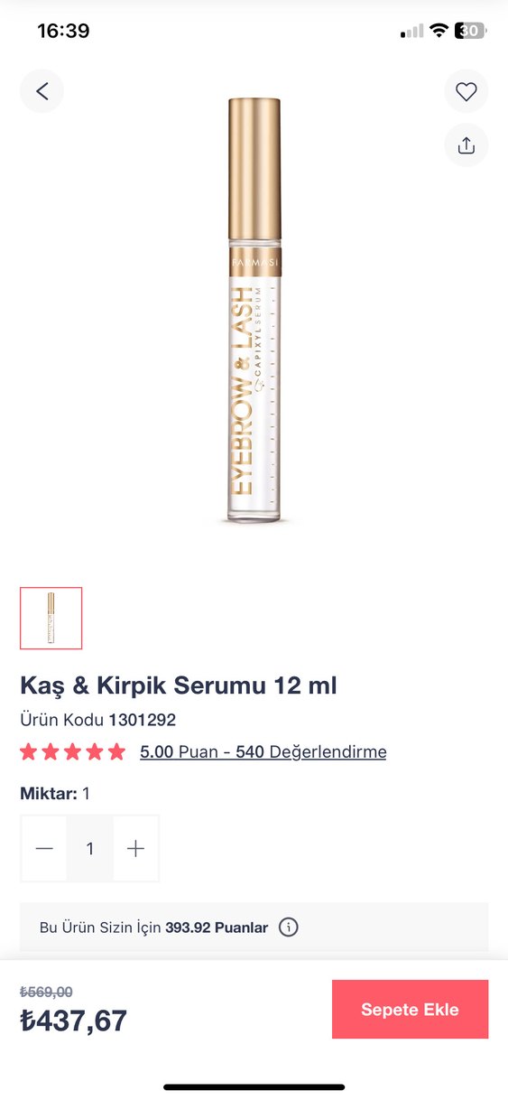 12 ml'lik altın renkli ambalajda kaş ve kirpik serumu. Kirpik ve kaş bakımı için uygundur.
