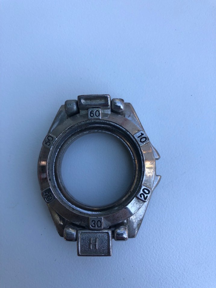 Nümerik bezelli gri vintage tarzı saat kasası, motosikletçi esintili tasarım. Metal yüzey aşınma izleri taşır. ⌚