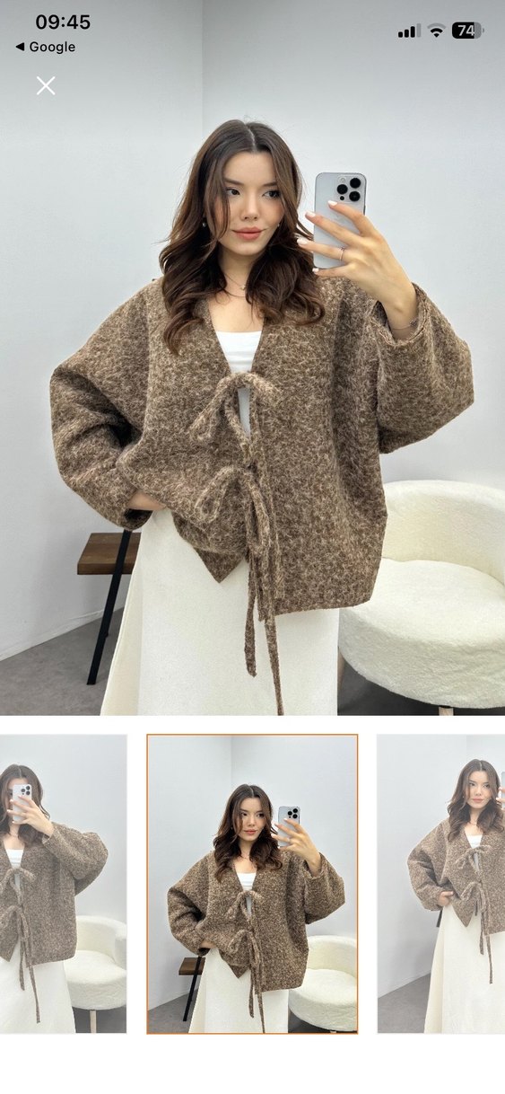 Salaş kesim, uzun kollu, V yakalı kahverengi örgü ceket. Midi boyda, ön bağcıklı, günlük kullanıma uygun rahat hiç giymedim etiketini koparttım ama hiçbir sorunu yok sadece kendime yakıştıramadım