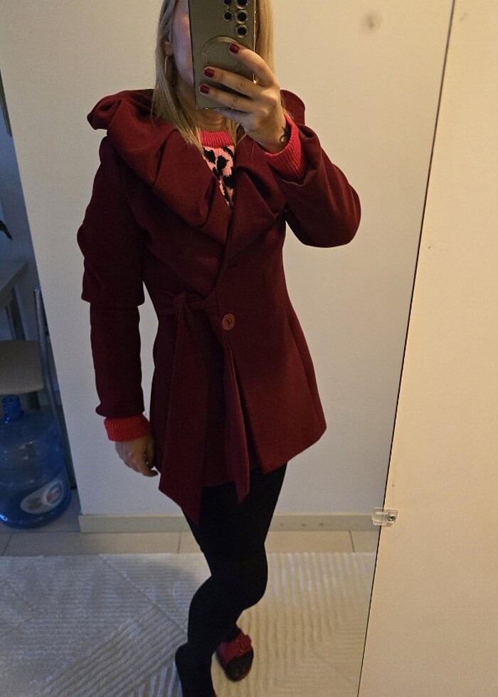 Urun görseldeki gibidir.bordo renkte belden kuşakli