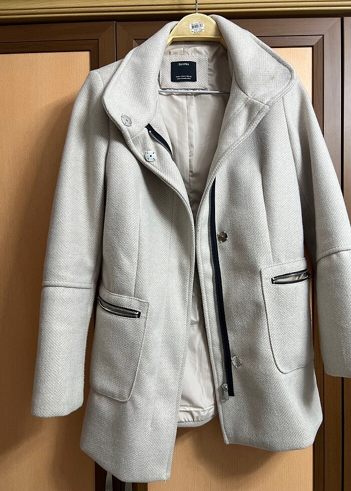 Bej renginde önde 2 tarafında fermuar var içi astarlı arkasında yırtmacı var hem fermuarlı hepde çıtçıtlı