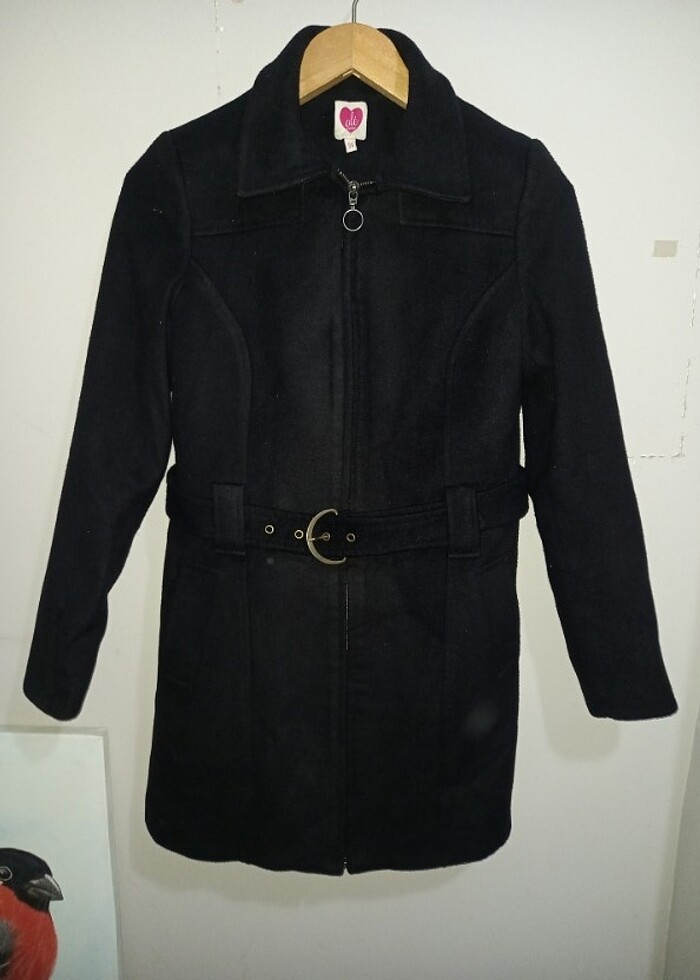 Kaşe kaban siyah önden fermuarlı kemerli astarlı cepli