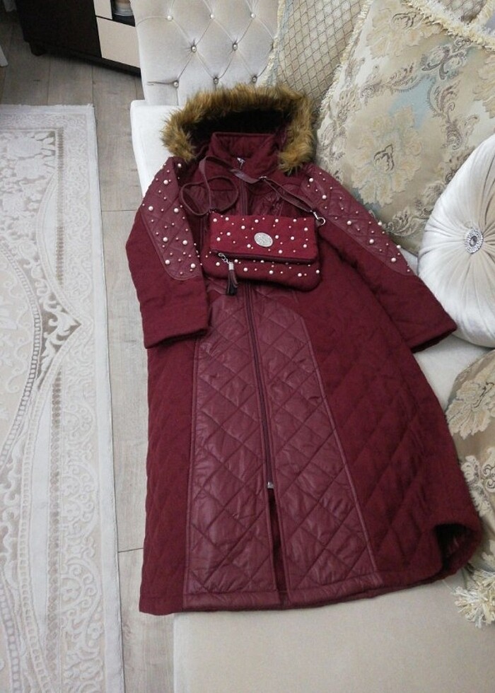Kaşe kapitone kumaş çantalı kaban kolları inci detay çantada aynı inci işleme alınan üründe iade yoktur