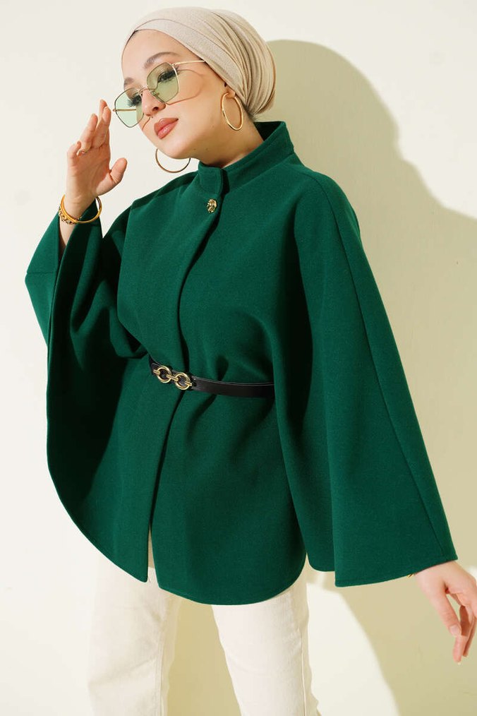 Kadınlar için kemerli, yüksek yakalı ve uzun kollu, bol kesim yeşil midi panço. Parlak renkli, günlük sokak stili için uygun. Sıfırdır etiketi üstündedir
