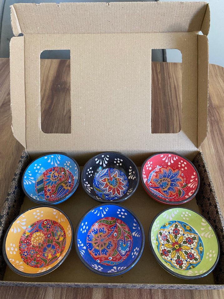 Sıfır ürün, hiç kullanılmadı. Renkli geleneksel desenlere sahip 6'lı seramik. sosluk, kahve yanı sunumluk için kullanışlıdır. Hiç bir sorunu yoktur. İade yok.
