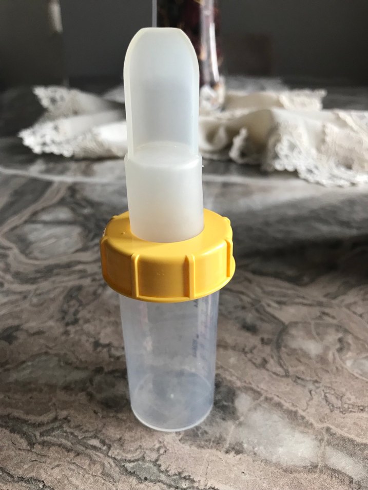 Bebek beslemesi için yumuşak silikon emzikli, sarı kapaklı ve saydam gövdeli bir biberon. Çok az kullanıldı