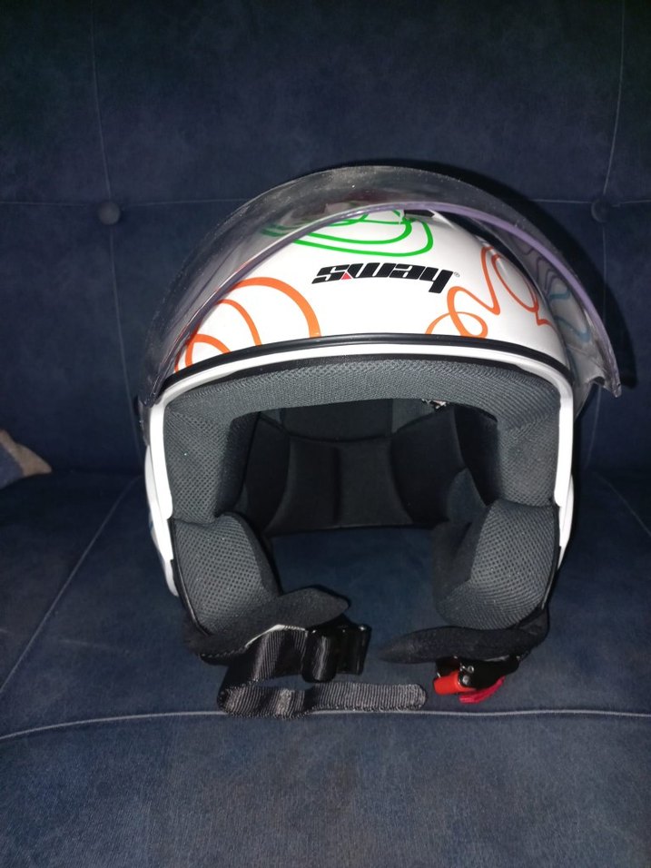 Beyaz renkli, parlak yüzeyli ve renkli desenli biker kask, rock punk havası taşıyor. Şeffaf vizör ve yastıklı iç kısmı rahatlık sağlar. Dış kabuk dayanıklı kauçuktan yapılmıştır. ️