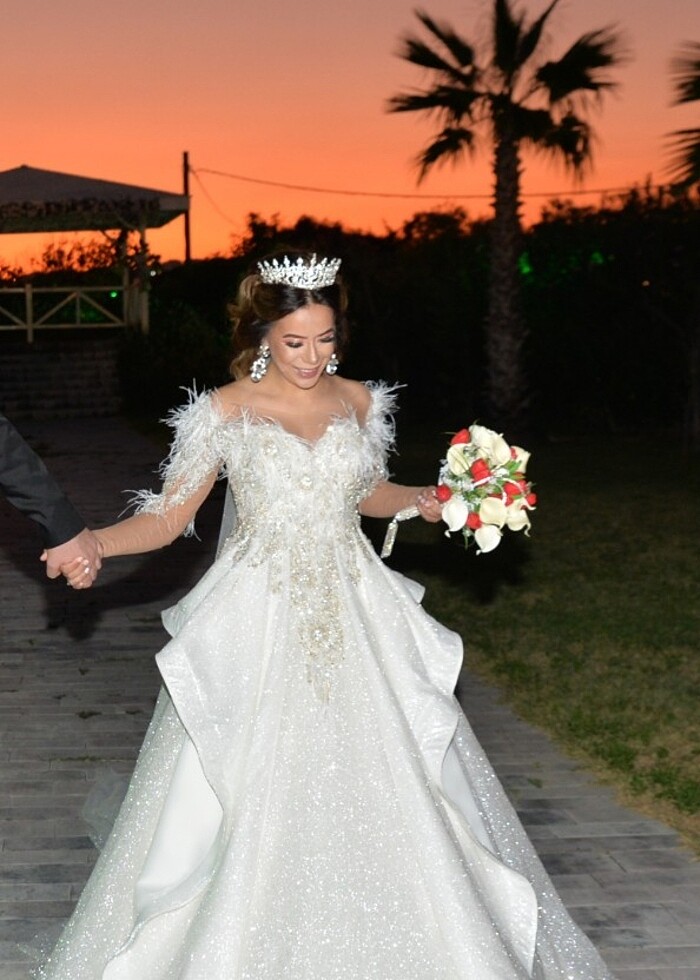 Kasnak işlemeli prenses model arkası bağlamalı olduğu için 38 m beden de uygundur. Hiç deformesi yok. Tarlatan, simli uzun duvak ve kısa duvak, çiçeğini de vereceğim. Dış çekim yapmadım bu yüzden sadece düğün günü giydim.