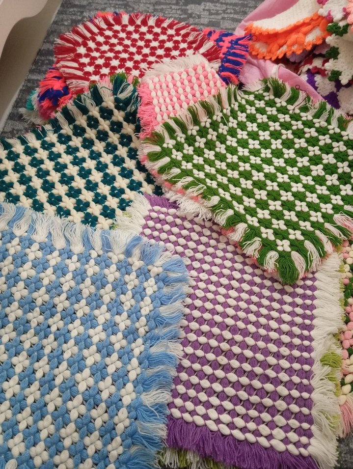 Farklı canlı renklerde, dokuma desenli ve püsküllü kenarlara sahip renkli banyo süngerleri seti. Nazik peeling ve temizlik için uygundur.