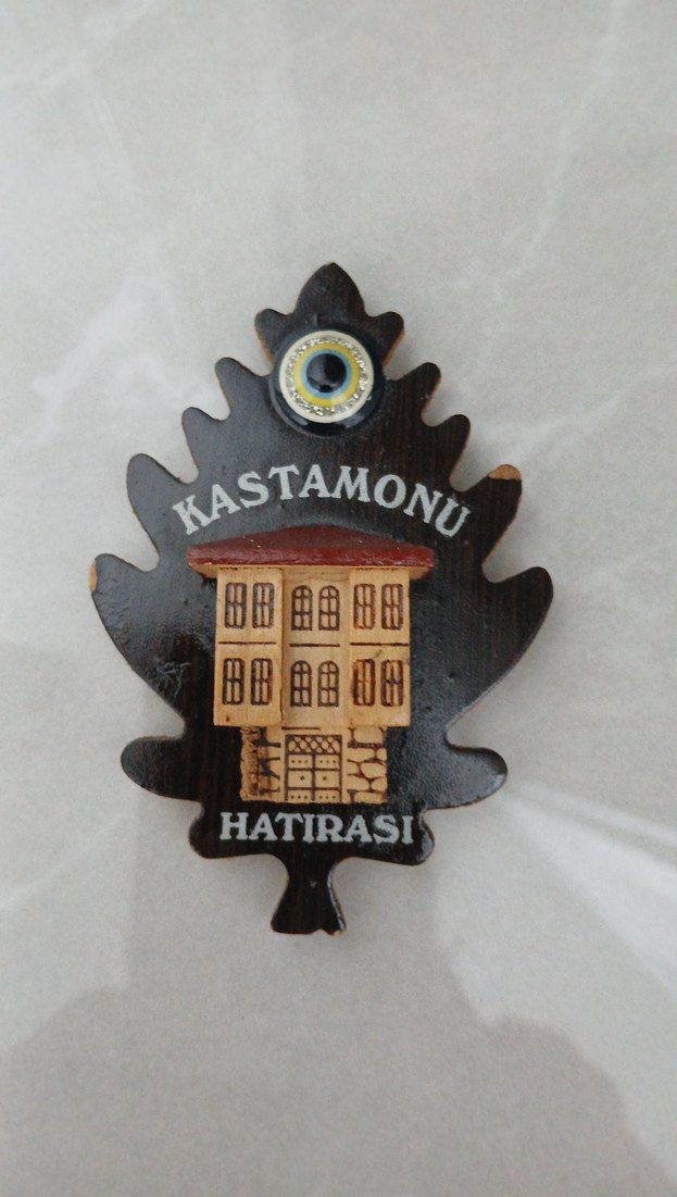 Kastamonu yazılı, yaprak şeklinde koyu kahverengi ahşap magnet. Üzerinde bina figürü ve nazar boncuğu yer alır.