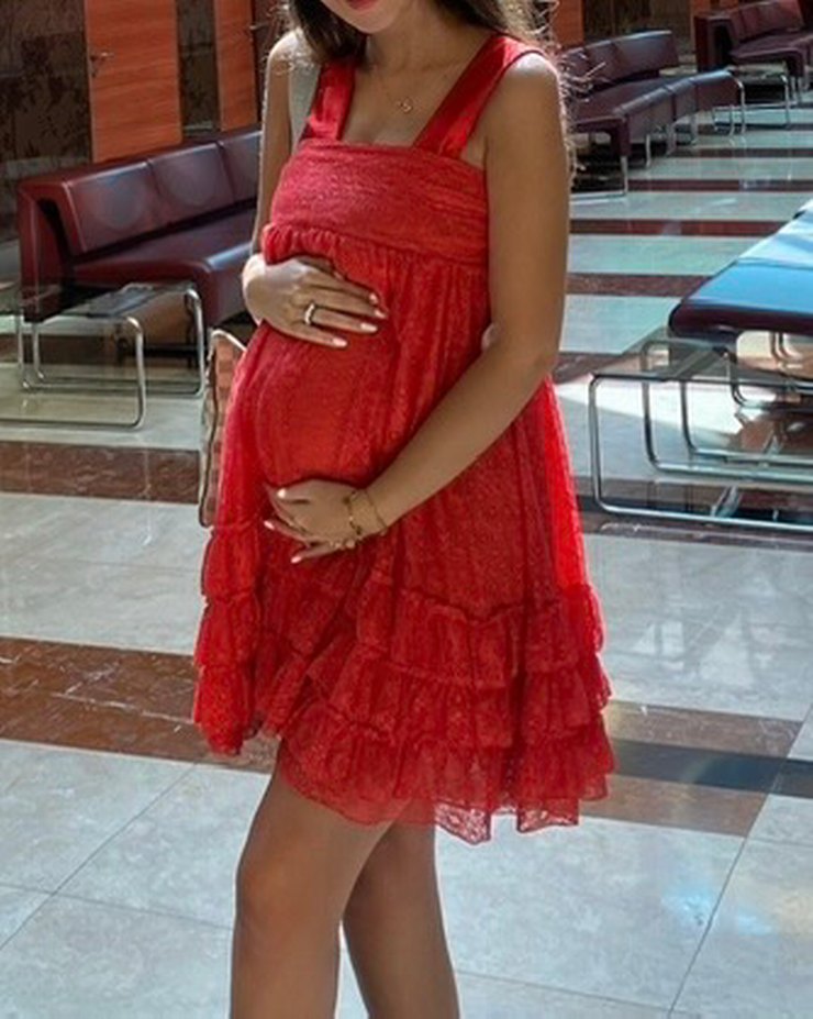 Hamile elbise, Kırmızı ve Dantel kumaş. Askıları saten geniş. Kat kat volan detaylarıyla bohem tarzı. Hamile değilken de giymiştim yine çok tatlı duruyor. M bedendir. s’ye de olur.
