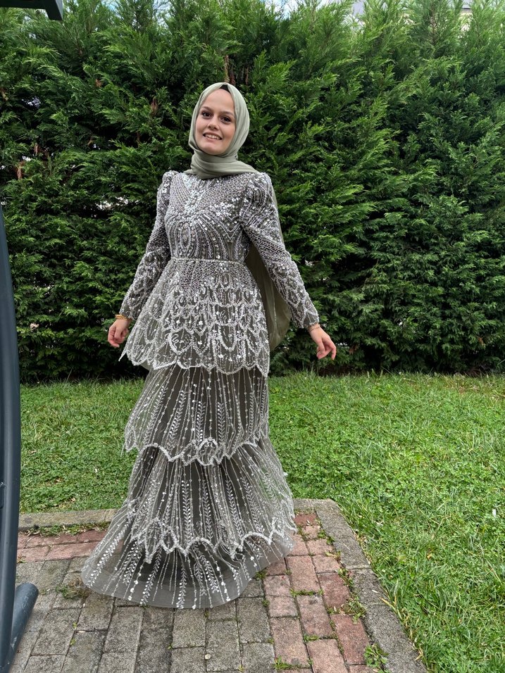 Uzun kollu, yüksek yakalı, etnik desenli ve drapeli detaylı, haki-gri tonlarında, rahat kesimli abiye elbise. Düğünler için uygun, bohem ve gösterişli tarzda. 36/38/40 beden seçeneği ile şal dahil kiralayabilirsiniz