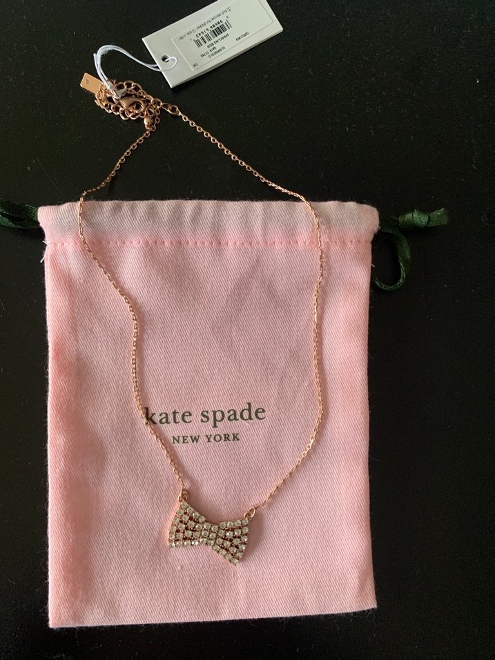 Kate Spade marka, altın renkli zincir ve fiyonk kolye ucu ile romantik akşamlar için uygun. Pembe torba ile beraber, midi boyda. Orjinal, etiketli