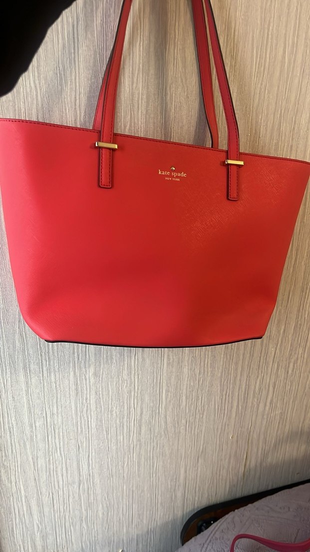 Kate Spade markalı, parlak kırmızı deri, baskılı detaylı kadın çantasıdır. Fermuarlı kapanışı ve çağdaş stili klasik zarafeti yansıtır.