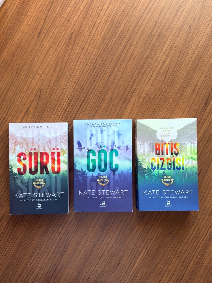 Kitaplar sadece bir defa okundu çok iyi durumdadır sıfıra yakın temizliktedir. Kate Stewart'in Sürü, Göç ve Bitiş Çizgisi adlı üç romanından oluşan set, farklı kapak tasarımlarıyla sunuluyor.