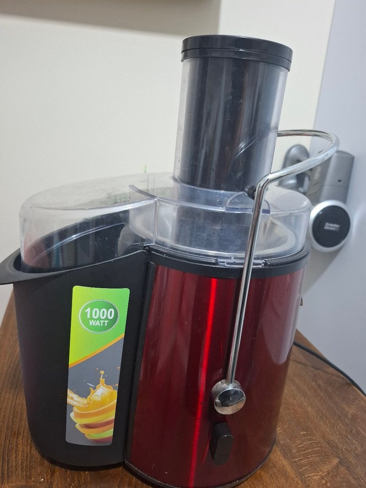 1000 watt motor gücüne sahip kırmızı katı meyve sıkacağı, şeffaf besleme haznesi ve güvenlik kilit kolu içerir. 1-2 kere kullanıldı sorunsuz