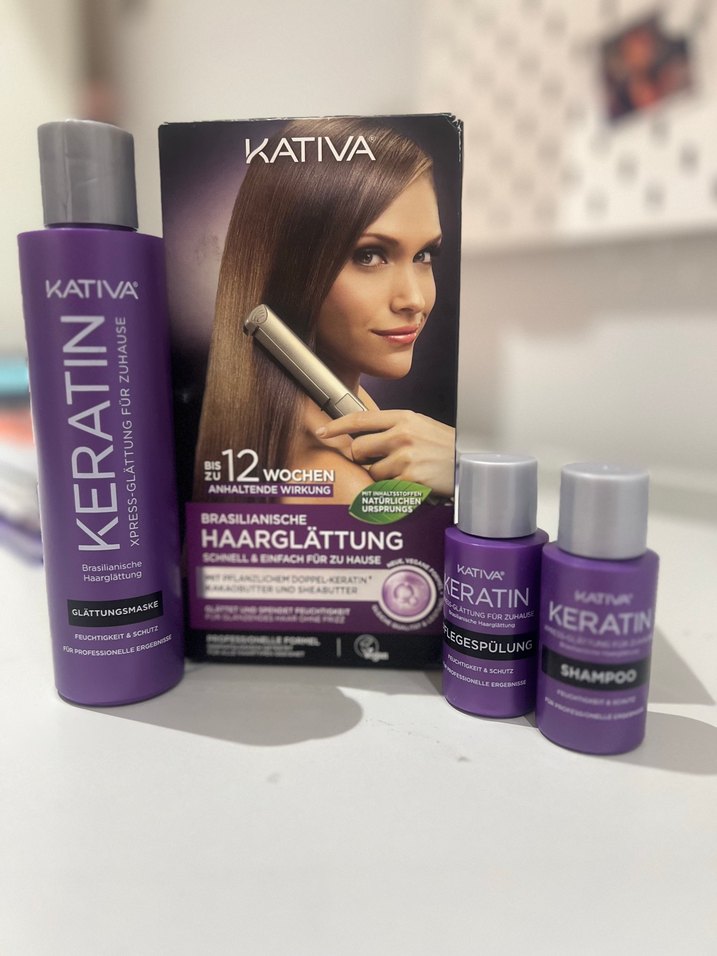 Kativa Keratin Brezilya saç düzleştirici seti; şampuan, düzleştirici maske ve saç kremi içerir. Saça 12 haftaya kadar pürüzsüzlük sağlar.