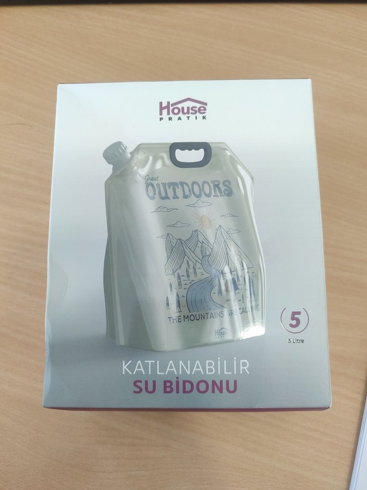 Beyaz ve gri renklerde, 5 litre kapasiteli katlanabilir su bidonu. Kamp ve seyahatler için pratik ve taşınabilir.