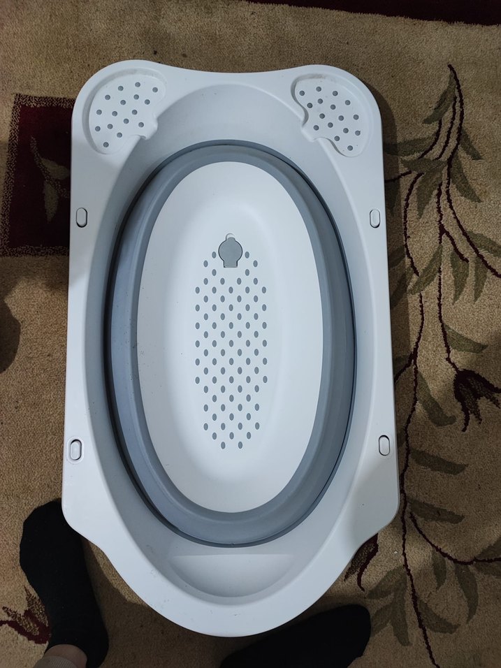 Kaymaz tabanlı, yan bölmeli, katlanabilir gri-beyaz bebek küveti. Kolay saklama ve pratik kullanım sunar.