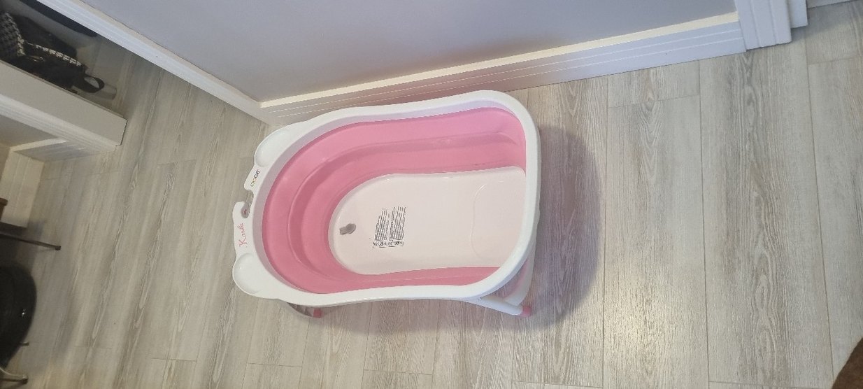 Katlanabilir, pembe ve beyaz tasarımlı bebek küveti, kolay temizlenebilir ve konforlu kullanım sağlar.
