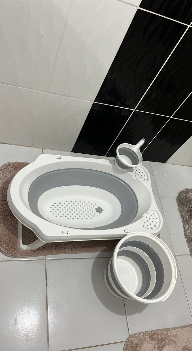 Katlanabilir silikon ve plastik malzemeden yapılmış bebek küveti, katlanabilir kova ve küçük kepçe içeren hijyen seti. Kullanımı ve temizliği kolaydır.