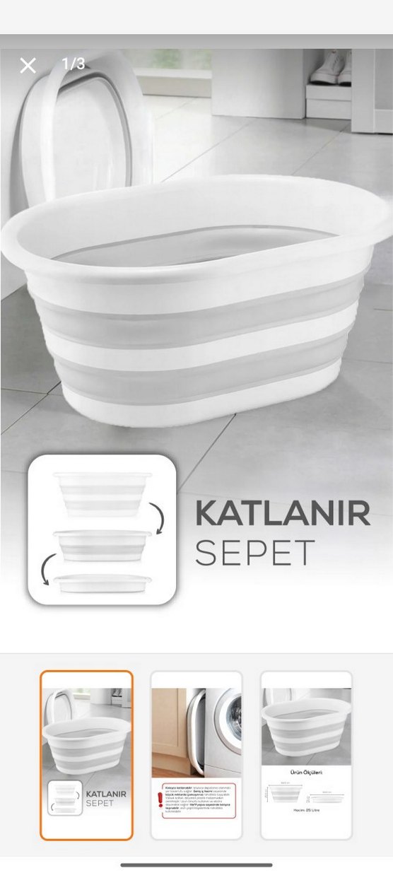 Beyaz ve gri renklerde katlanabilir sepet, kullanım sonrası kolayca katlanarak yer kaplamaz.