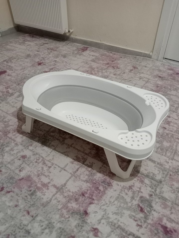 Katlanabilir beyaz ve gri renkte, kaymaz ayaklara ve su tahliye deliklerine sahip bebek küveti. Bebek banyosu için uygundur. Çok az kullanıldı sıfır hiçbir sorunu yok.