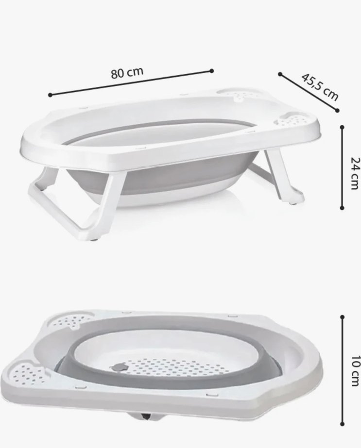 80x45,5 cm ölçülerinde, beyaz ve gri renkte katlanabilir bebek küveti. Kolay saklama ve pratik kullanım sağlar.