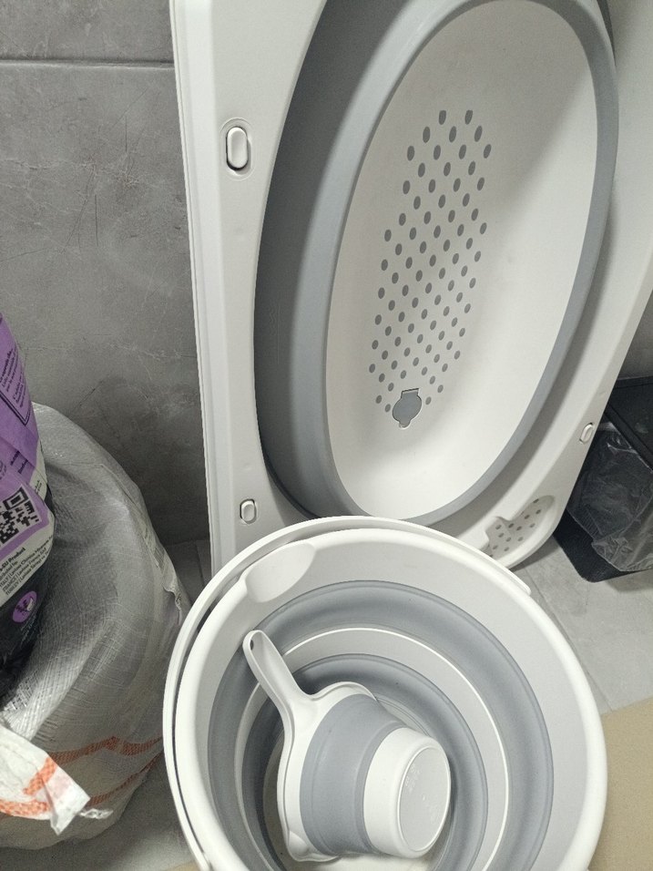 Katlanabilir tasarıma sahip beyaz ve gri yüz temizleme cihazı, kompakt ve saklaması kolaydır. Hassas kullanım için küçük bir kepçe içerir.