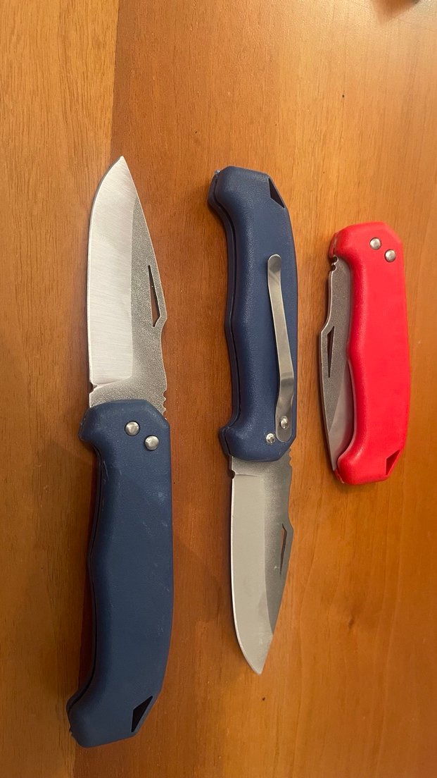 Mavi ve kırmızı saplı, paslanmaz çelik bıçaklı katlanabilir cep bıçakları. Taşıma klipsi bulunur. ÖZPROX takım fiyatı