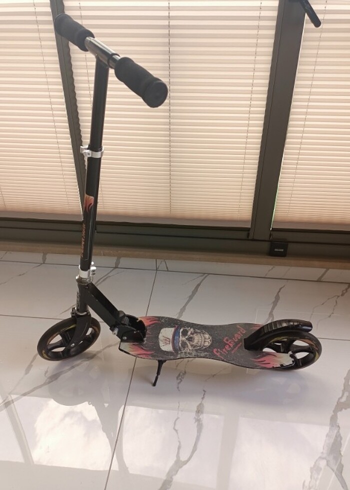 Katlanabilir Scooter. Kaliteli Kauçuk tan lastikler. Ayakta durması için ayaklık mevcut.