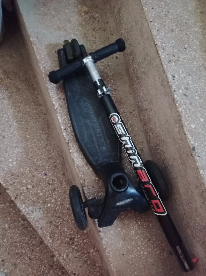 Katlanabilir tasarıma sahip siyah çocuk scooterı, üç tekerlekli denge ve kolay kullanım sağlar. Sağlam gövde ve rahat tutma yerleri bulunur. ❌ama tutacak yerin bitanesi çatlak kırık❌ kaynak olabilir yada değiştirebilir.ufak çizikleri var